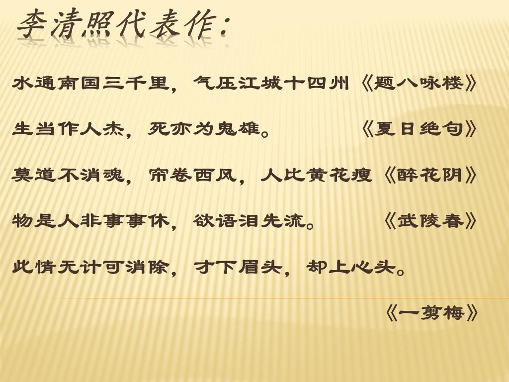 历史人物模板:李清照,宋代女词人,婉约词派代表,语言清丽,强调协律,崇尚典雅,提出词“别是一家”之说,有“千古第一才女”之称。