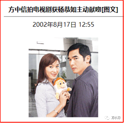2002年,方中信在《烈火雄心2》中饰演“24孝好男人”,圈了一波粉。同年,又监制并主演了电视剧《一切从结婚开始》,收到合作女星杨恭如的红唇烈焰印,搞了点小动静。