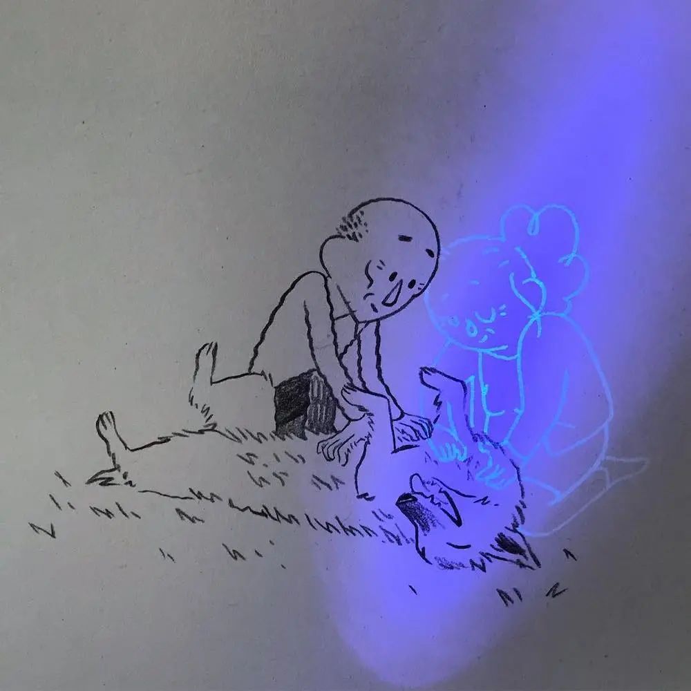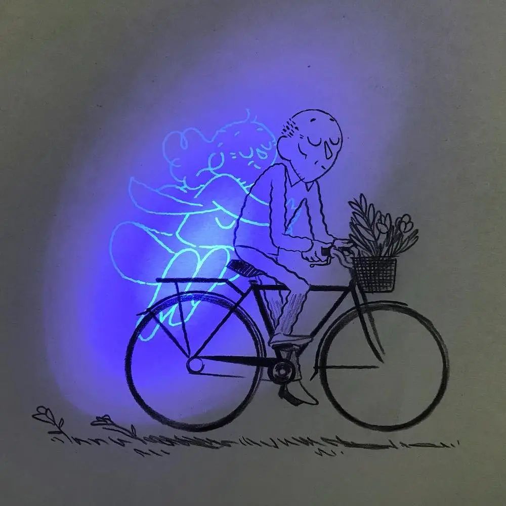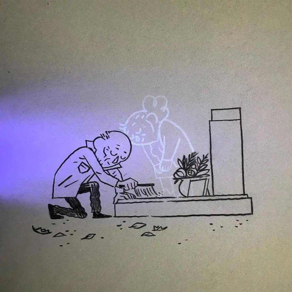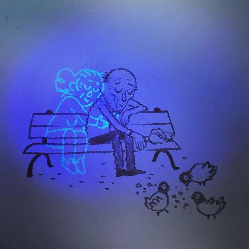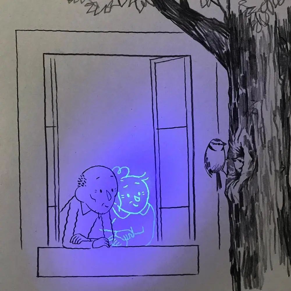 这种有趣的插画奥秘就在于他使用的材料上,玛蒂尔德·多梅克在绘制这组作品时,在画完显现的画面后,又用荧光材料增加了一个老人,于是,经过灯光照射后,我们就可以看到两个老人相互依偎,相互照护的温馨场景。