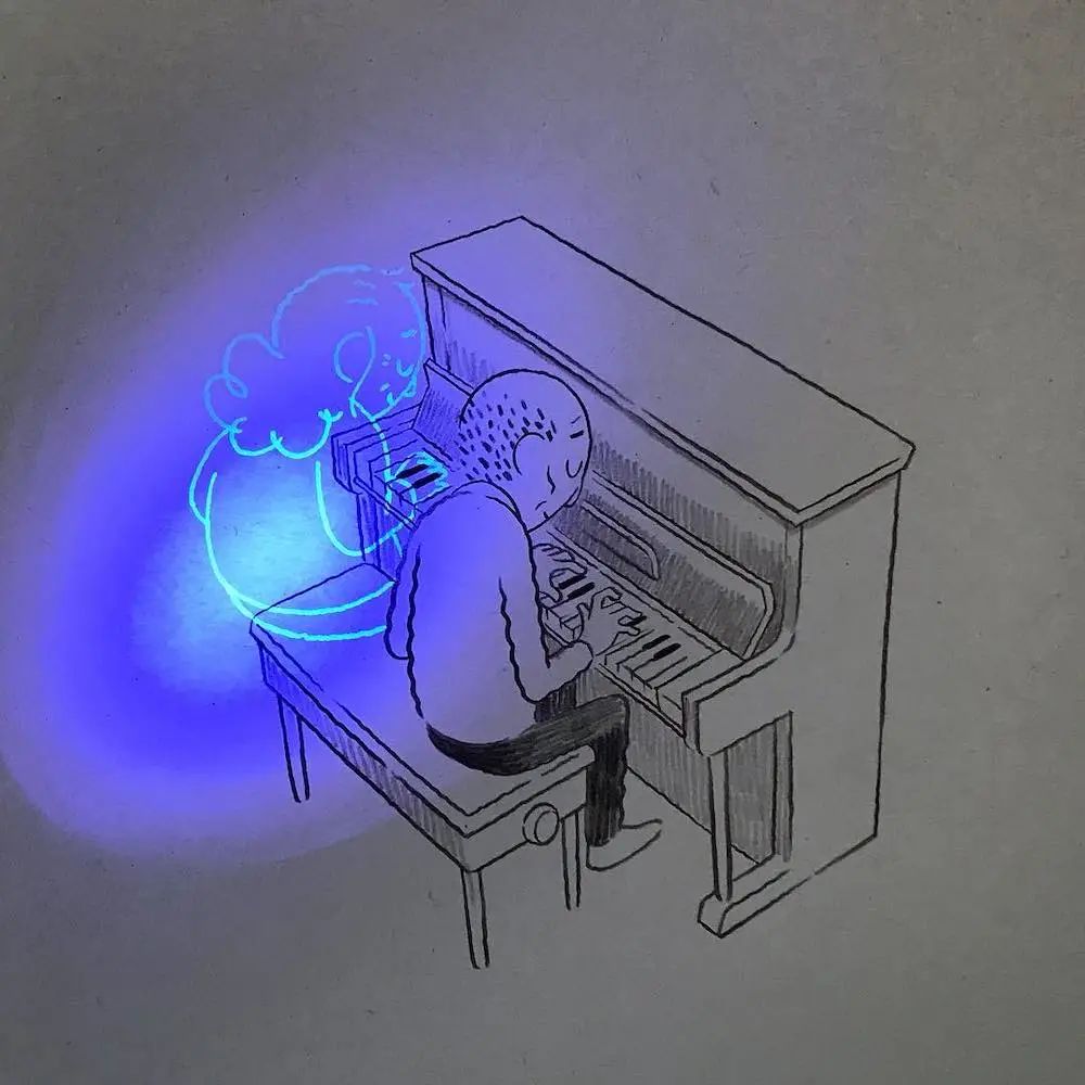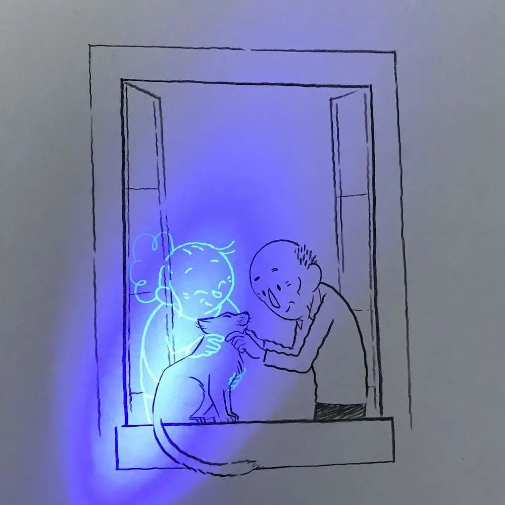 不过,我们每个人都清楚地知道,荧光照射下出现的老人早就离开了这个世界,虽然,玛蒂尔德·多梅克的插画非常简单,但是,这组作品给我们带来的触动一点都不逊色那些复杂的画作,欣赏这组插画作品也让我们意识到身边陪伴我们的那个人重要性,不要等到失去他们之后才后悔没有好好对待他们。