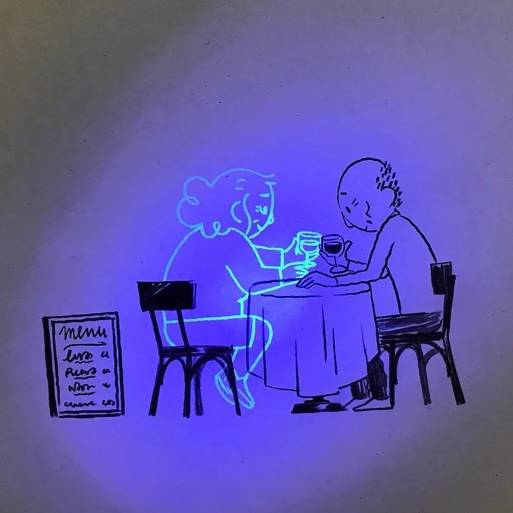 这组名叫《爱情幻影》的插画作品,描绘的是一个老人的生活,在我们肉眼可见的场景中,这位老年人一个人吃饭、一个人游玩、一个人发呆。在这个场景中背后,还有一个我们看不到的场景,只有用蓝色的灯照射下才会显现出来。