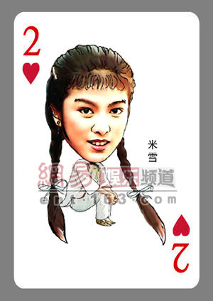 红桃2:米雪作品:《绝代双骄》—— 苏樱(1979年9月)《苏乞儿》—— 萧玲(1982年9月)《少林与咏春》—— 严咏春(1988年2月)《开心华之里》—— 程如珠(1993年至1994年)《万 里长情》—— 袁秀兰(1995年)《包青天》之《忘情酒坊》——杜十三(1996年2月) 《美丽人生》—— 陈娇(2001年2月)《倚天屠龙记》—— 殷素素(2001年4月)《学警雄心》——陈燕婷(ivy) (2005年4月《秀才遇著兵》——金英(侠盗飞鹰) (2005年6月)《人间蒸发》—— 江丽萍 (2005年10月/客串5集) ……