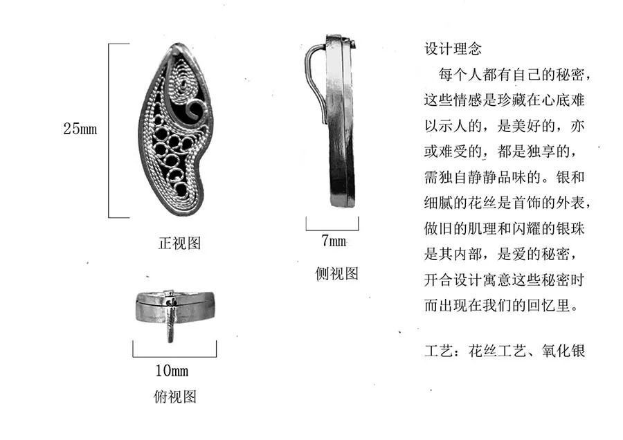 每个人都有自己的秘密,这些情感是珍藏在心底难以示人的,是美好的,亦或难受的,都是独享的,需独自静静品味的。银和细腻的花丝是首饰的外表,做旧的肌理和闪耀的银珠是其内部,是爱的秘密,开合设计寓意这些秘密时而出现在我们的回忆里。