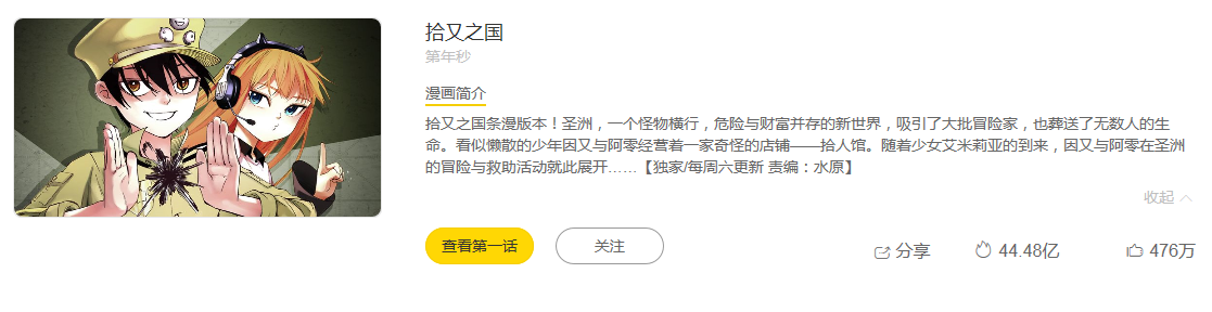 《拾又之国》漫画是由中国著名漫画家第年秒创作,翻翻动漫出品的少年魔幻冒险漫画,讲述了主人公因又在神秘圣洲拯救探险家们的热血故事。本漫画曾在翻翻动漫旗下漫画杂志《翻漫画》进行连载,之后于国内最大的网络漫画平台之一的快看漫画上线彩色条漫版,收获了众多粉丝的支持。