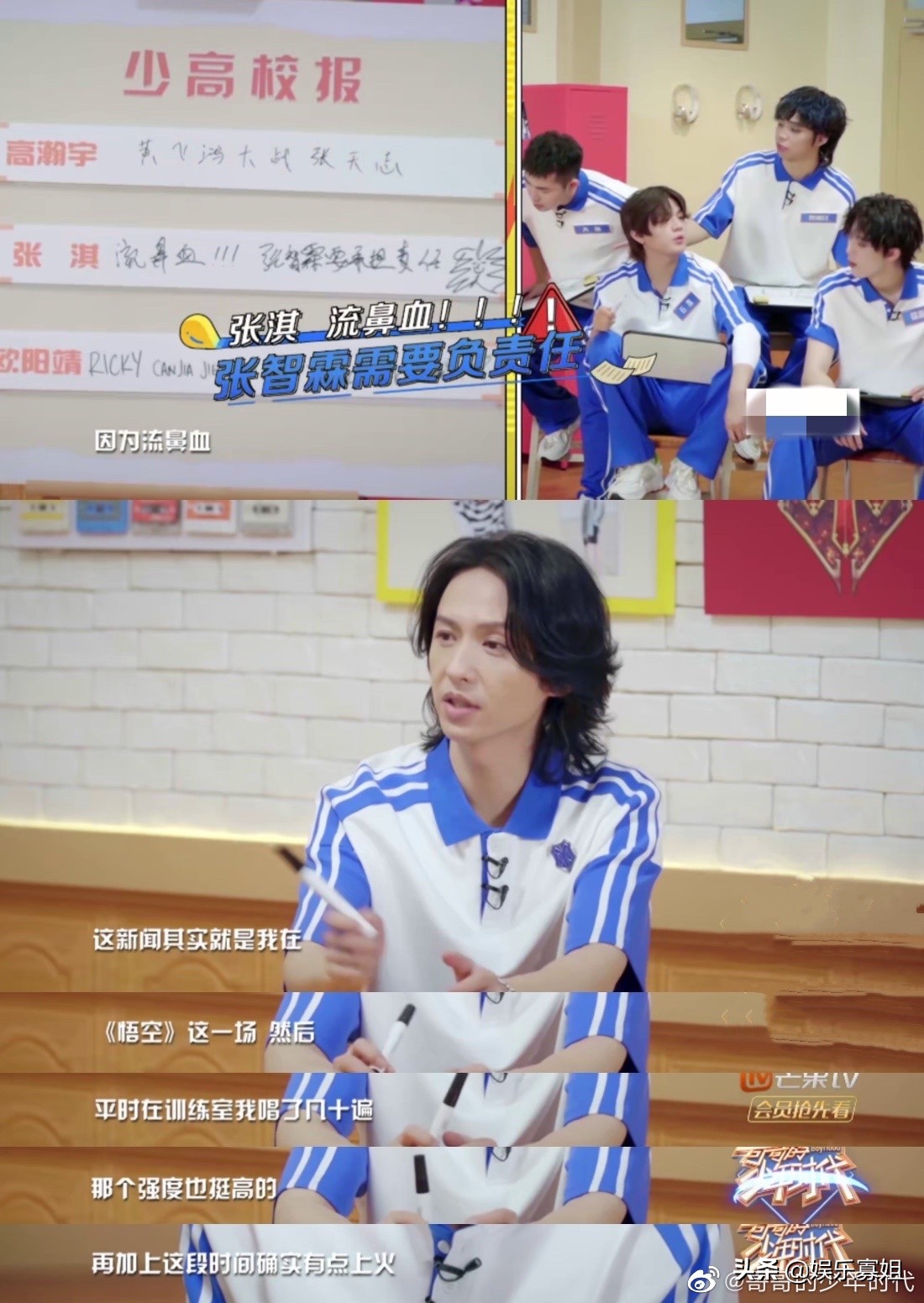 10月6日,在《哥哥的少年时代》抢占头条环节,张淇写下了“张淇流鼻血张智霖需要承担责任”这样的标题党,张淇称是网友剪辑张智霖跳舞的视频,再配上自己上火流的鼻血的画面。并回应流鼻血的原因,称是因为《悟空》舞台练习太多次,加上上火了。还肯定了网友的创意剪辑,表示很有意思。