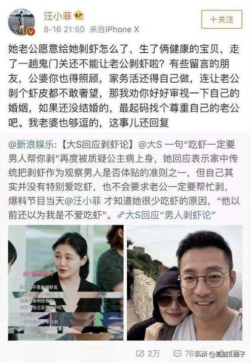 后来大s因为这段“剥虾论”被网友骂公主病、矫情,反而激起了汪小菲的保护欲 ,在网上为妻子抱不平:她老公愿意给她剥虾怎么啦??