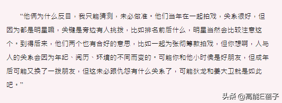 最后姜大卫还说,“对人好,不要期望别人对你好,这也是张彻教的。”这番言论,让“倾国倾城”成为狄姜cp分手流传最广的原因。