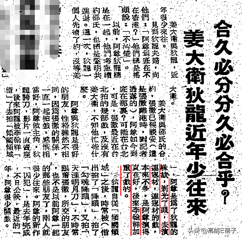 不是后来的网友yy,1976年的报章已写过俩人因为《倾国倾城》“合久必分”,后续是,之后狄龙有了更多被“借”走拍戏的机会,朋友圈也不只是小姜那批人了。