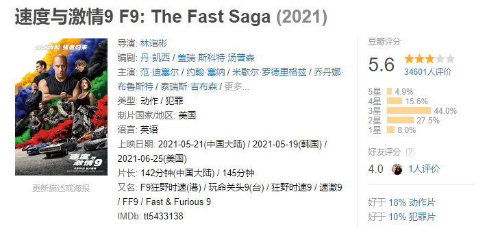 但从映后口碑来看,速激9却很可能要刷新系列下限,开分6分,上映后已经掉到了5.6,成系列最低分(注:评分仍有下降趋势)。