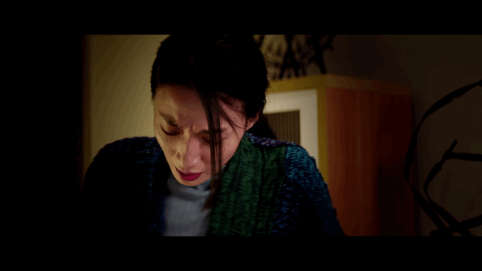 她的眼神晦暗、面容憔悴,直接让人感受到这是一个长期生活在不安环境中的女人。虽然根据之后的剧情可以得知此时她摆脱了家暴男,但家暴带来的伤害依然在她身上留下了明显的烙印。