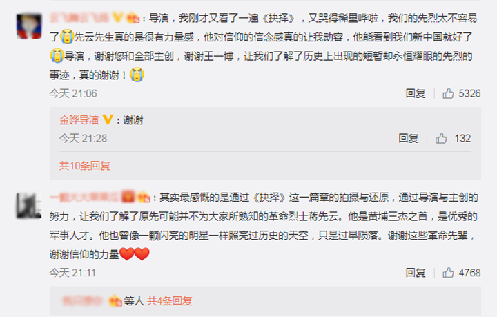 6月19日,导演金晔在个人社交平台中晒出与蒋先云侄孙蒋美成的聊天记录,作为蒋先云的后人,蒋美成自然喜欢看自己先人的故事,他在看完《抉择》后表示:“我看了3遍《抉择》,演得不错,拍得很好!谢谢金导演!谢谢王一博!谢谢所有台前幕后的演职员!请你向他们传达蒋先云烈士后人们的感谢和致敬!”