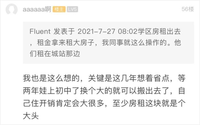 楼主说,她原打算攒攒钱,等孩子上初中后置换大套搬出去,如果现在出去租房子,开销肯定更大,至少房租就是很大一笔钱。