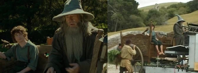 此外由于霍比特人在设定上比人类小,拍摄时还得根据实际情况,通过后期特效、替身、强迫透视法(错位拍摄)等方法进行。在运用强迫透视法,即错位时,霍比特人的演员为了“变小”要站在后面,假装与身居前面的表演者互动对视。镜头里看似两个人在面对面说话,实际上是各自对着空气表演,真的是十分辛苦了。