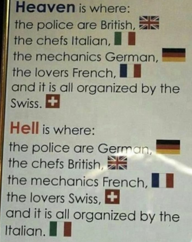 地狱则是德国的条子、英国的厨子、法国的机械师、瑞士的情人,而这一切都由意大利人安排组织。