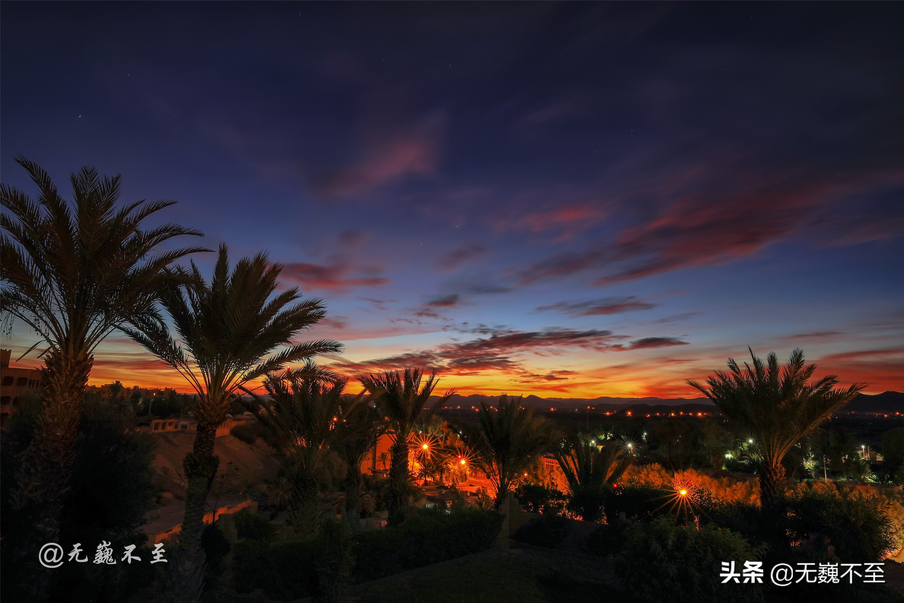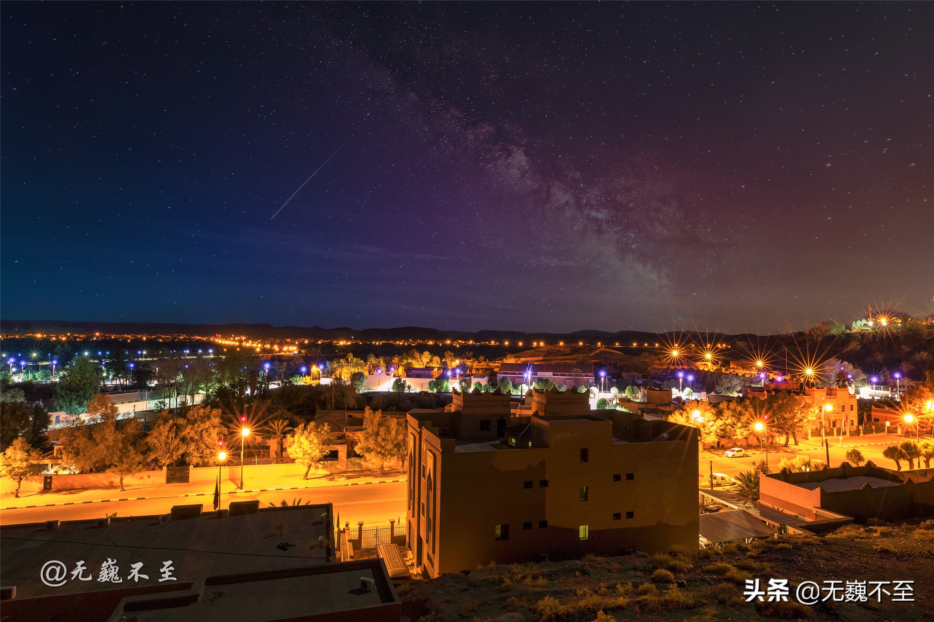 清晨的瓦尔扎扎特安详而宁静,由于时差还未倒过,干脆抓起相机脚架溜出房间趁着夜色尚未消退,欣赏这座沙漠之城的夜景,凉风习习,空气薄凉,淡淡的星河蹦出一滴流星泪,在月色压迫下黯然退场,远处城市的辉煌灯火则在小光圈长曝光中迸散出耀眼的星芒!