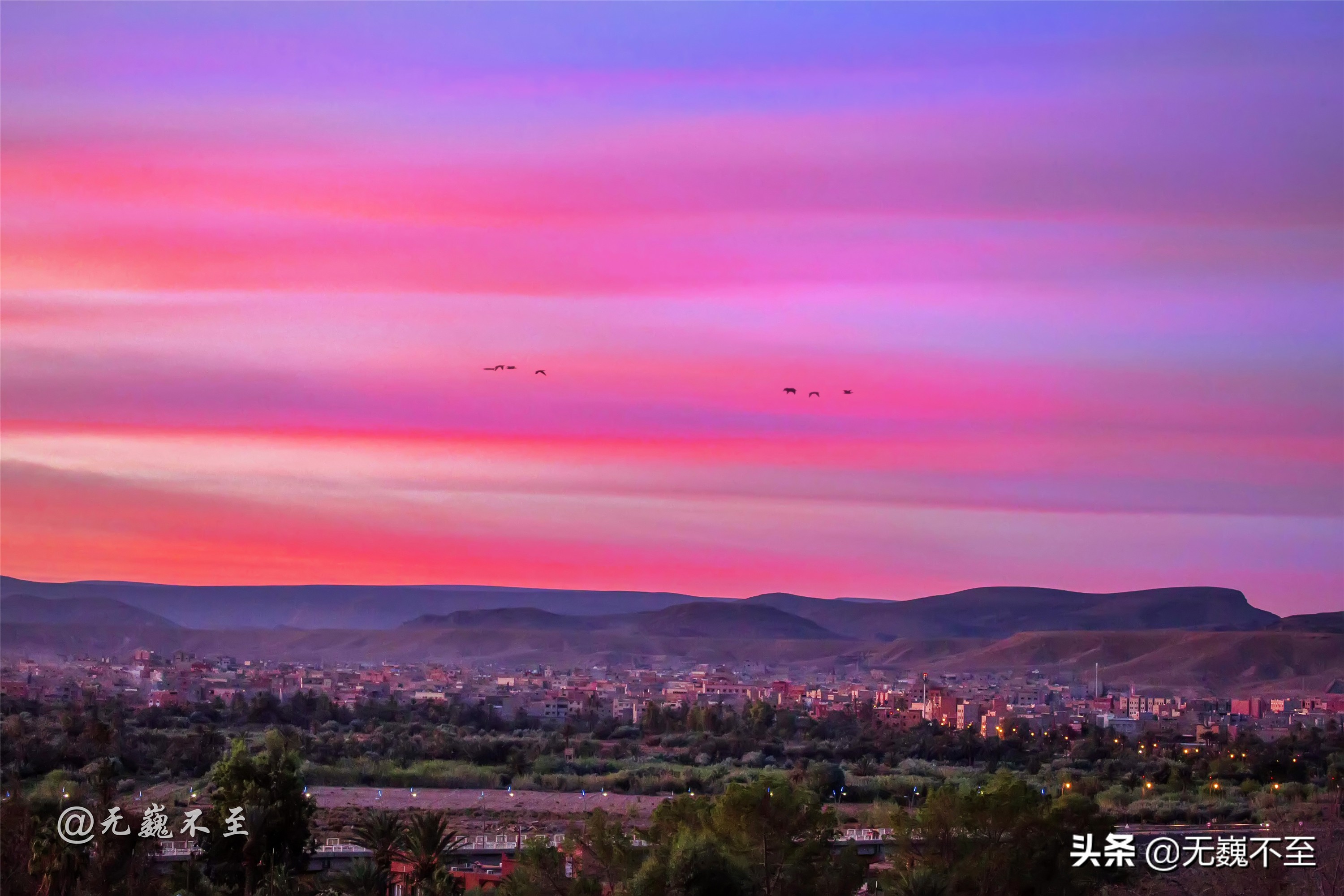 这莫非就是传说中的异彩纷呈?美得令人窒息的天幕缓缓升上半空,太阳依然没露出脸庞,唉!该来的早晚会来,但是这场本该完美的日出却没机会看了!因为守时的我必须走啦,去撒哈拉的大巴约定时间到啦,只好遗憾滴说goodbye!再见,美丽的瓦尔扎扎特!日出,撒哈拉见!