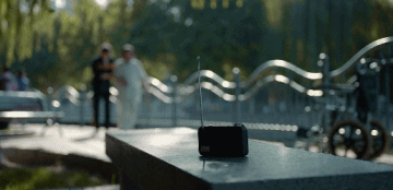 请注意这个镜头,先是给了收音机,再给两个骗子。