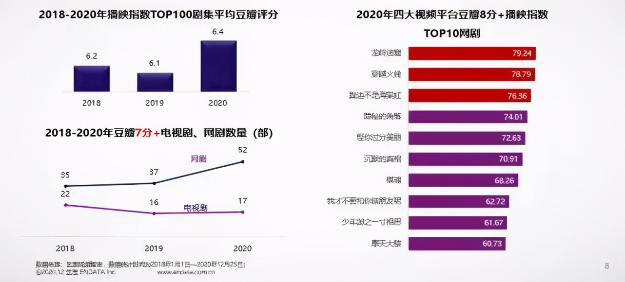2020年头部剧整体口碑水平提升,豆瓣7分+高口碑国产剧占剧集总量17%,高品质剧越来越多……豆瓣7分+网剧数量同比提升41%,网剧制作进入精品化、专业化阶段。
