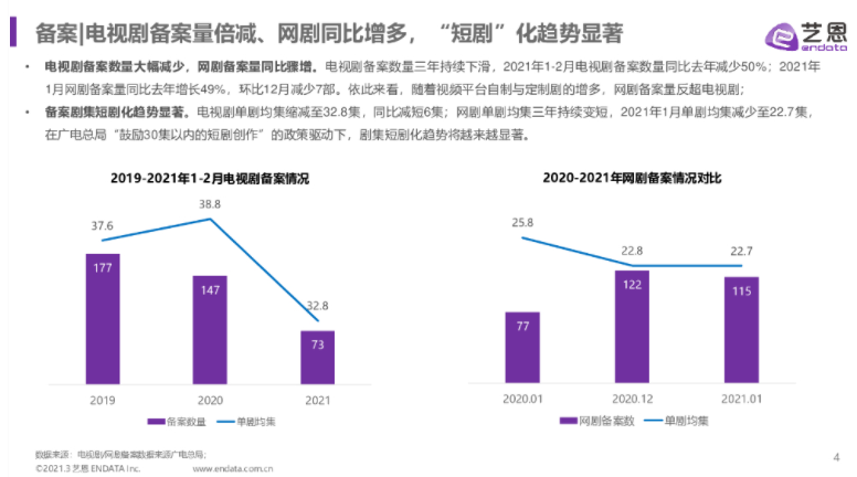 2021年1-2月电视剧备案数量急剧下滑,反之网剧备案量骤增,剧集短剧化趋势越来越明显。q1网剧提质减量、精品化程度进一步提升,“3+x”类型趋势越来越显著。