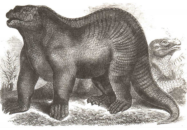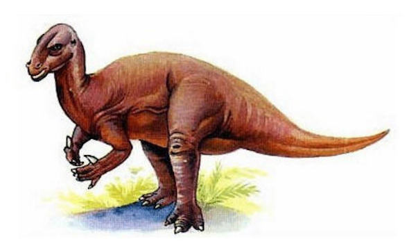 正如它的名字一样,当时学界认为,属于爬行动物的恐龙应该是那种大象一般大小,由于冷血而不能活蹦乱跳、只能在茂密的裸子植物森林里挪动的傻大笨粗形象。作为人类最早发现的恐龙之一,禽龙的化石在1822年首次发现,并在1825年由英国地理学家吉迪恩·曼特尔进行新种描述,但他将其复原成了远古时代的大鬣蜥(“禽龙”学名iguanodon,意为“鬣蜥的牙齿”)。曼德尔按照蜥蜴身体各部分的比例代入禽龙化石,于是,复原出来的禽龙倒真的成为了一只长达200英尺的“恐怖的蜥蜴”。它与今天的鬣蜥一样有一条长长的尾巴,弯曲的四肢支撑着巨大的躯体(今天我们知道禽龙是直立行走的),最引人注目的是,这只禽龙的鼻尖上还错误地长着一个角(后来的研究证明那是禽龙的拇指爪)。