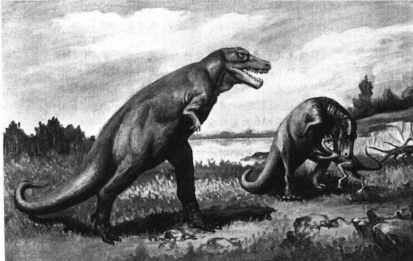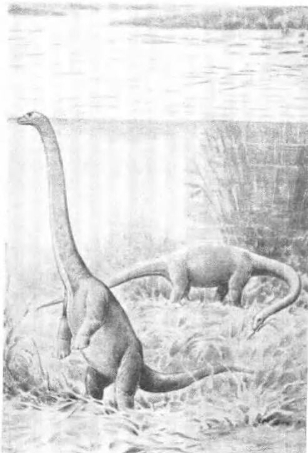 十九世纪后期,古生物考古取得了巨大进展,好几种体型巨大的恐龙化石相继出土。这些巨型恐龙被认为是两栖或者水生的:它们慢吞吞的在湖底蹒跚而行,啄食鲜嫩的藻类和水生植物,除了偶尔把长达7米的蛇状脖子探出水面,几乎一整天都不露面——当时的科学家无法想象这些体型大过现存最大陆生动物非洲象数倍的庞然大物可以依靠自己的四肢承受如此重负。
