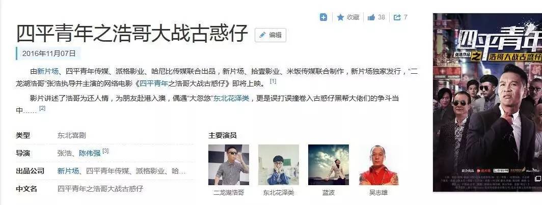 随着“二龙湖浩哥”ip的大火,此系列的出品方也从淘梦网一家,发展到《偷天换日》时的四、五家,再到2016年由北京若干家电影与文化传媒公司投资制作的《四平青年之浩哥大战古惑仔》,背后的资本已经涉及到了行业小巨头新片场。