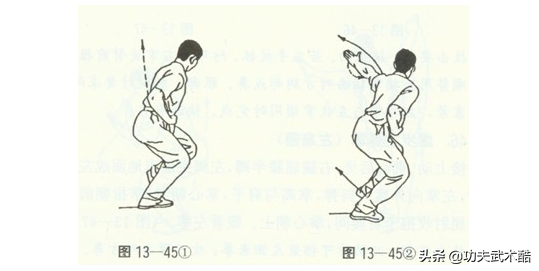 ①左脚提起向右侧上方跨出,身体右转90。(朝正西);右脚蹬地跳起,身体腾空。同时右掌向右侧摆起,臂高与肩平,掌心朝前,掌指朝右;左掌屈肘横于右肩前,掌心朝内,掌指朝右。眼看左前方。(图13-62①)