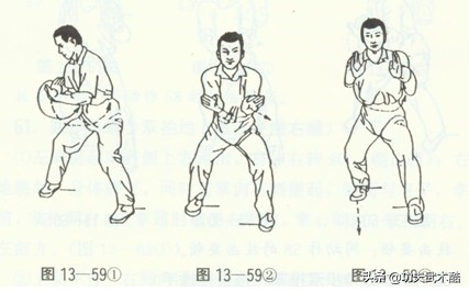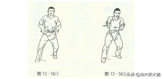 接上动,脚步不变。两掌向下以小指一侧为力点向小腹处猛砸;然后立即向前上方猛力屈腕上挑,略屈肘停于腹前,掌心朝前,掌指朝上。眼看两掌。(图13 -56①②)