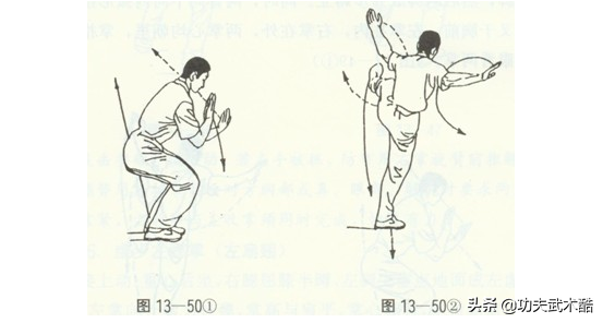 ②紧接上动。右腿挺膝站立;左脚屈膝提起,勾起脚面向左侧上方猛力蹬出,脚高与胸齐。同时,两掌以小指一侧为力点,向两侧猛力横砍,掌高与肩平,两掌心均朝下,掌指均朝前。眼看左掌。(图13 50②)
