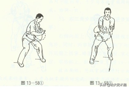 ①左脚向前上一步,脚尖稍内扣;两腿屈膝,身体右转90。(朝正西)。同时,两掌向下向里弧形摆,然后屈肘扣腕上穿,停于腹前,两掌背相靠,掌指均朝上。眼看两掌。(图13-59①)