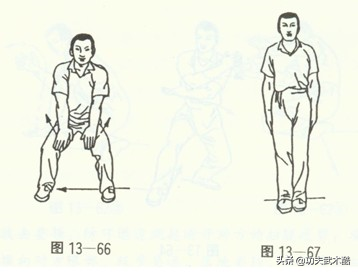 右脚后收经左脚内侧弧形向右侧跨出一步,两腿屈膝半蹲成马步。同时,右拳变掌,两前臂内旋,两掌心翻向里,使掌指朝下,直臂向下猛力插出,停于大腿内侧,掌背朝前。眼看两掌。(图13-66)