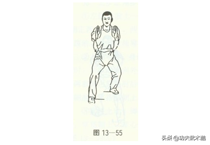 上动不停,脚步不变。两掌向前直臂猛力推出,掌高与肩平,掌指朝上,掌心斜相对。眼看两掌。(图13-55)