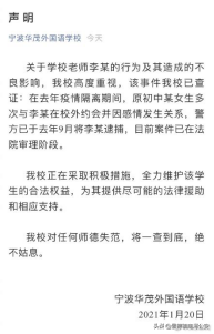 李某是宁波华茂外国语学校一名老师,在2020年疫情隔离期间,与该校一名初中女生多次在校外约会并且因感情而发生性关系。