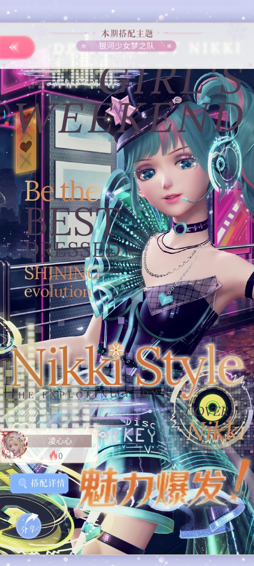 最后背景一定要弄成那种有银河或者宇宙的黑夜魔幻风格,贴纸不要吝啬,最好是把整个场地全都铺满,英文字母一定要多多的用上,都是不错的可以提高评价和分数的小技巧,另外这里吐槽一下竞技场第二期的那个泳装似乎很适合这次的搭配赛主题。