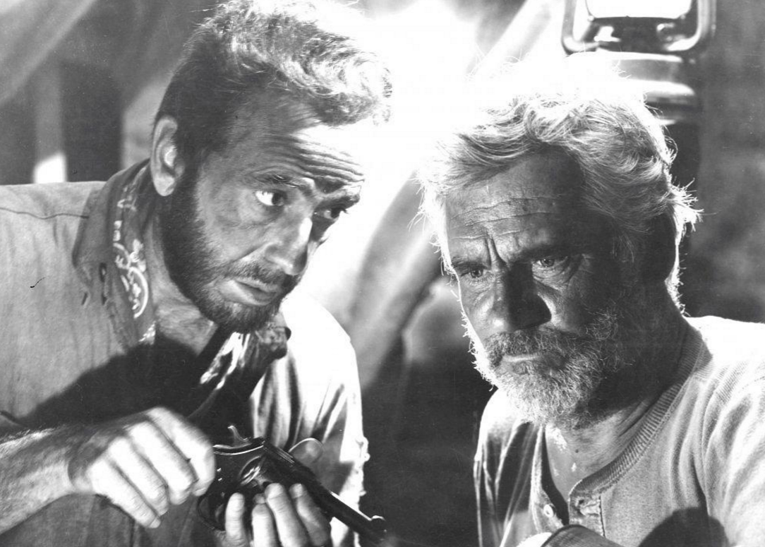 《碧血金沙》,该片于1948年上映,主要讲述的还弗雷德(亨弗莱·鲍嘉 humphrey bogart 饰)和鲍勃(提姆·霍尔特 tim holt 饰)是两名穷困潦倒的流浪汉,一日,在酒吧中,他们从精明智慧的霍华德(沃尔特·休斯顿 walter huston 饰)口中听闻了有关金矿的消息,走投无路的两人打起了淘金的主意,他们谎称是猎人,驻扎在了山上。经历了种种苦难的挫折,幸运的三人找到了金矿。然而,随着金砂数量的增加,原本相互信任的三人之间出现了裂痕。 在一次下山采购的过程中,名叫科迪(布鲁斯·班尼特 bruce bennett 饰)的年轻人发现了他们秘密,跟随而来的科迪表示想要从中分一杯羹,三人决定杀之而后快。就在这个节骨眼上,一群土匪开始向山上进发,他们想要的是这三个“猎人”狩猎得到的“兽皮”。在种种阴谋和贪婪本性的趋势下,本来有着美好前景的三人走向的破灭的结局。
