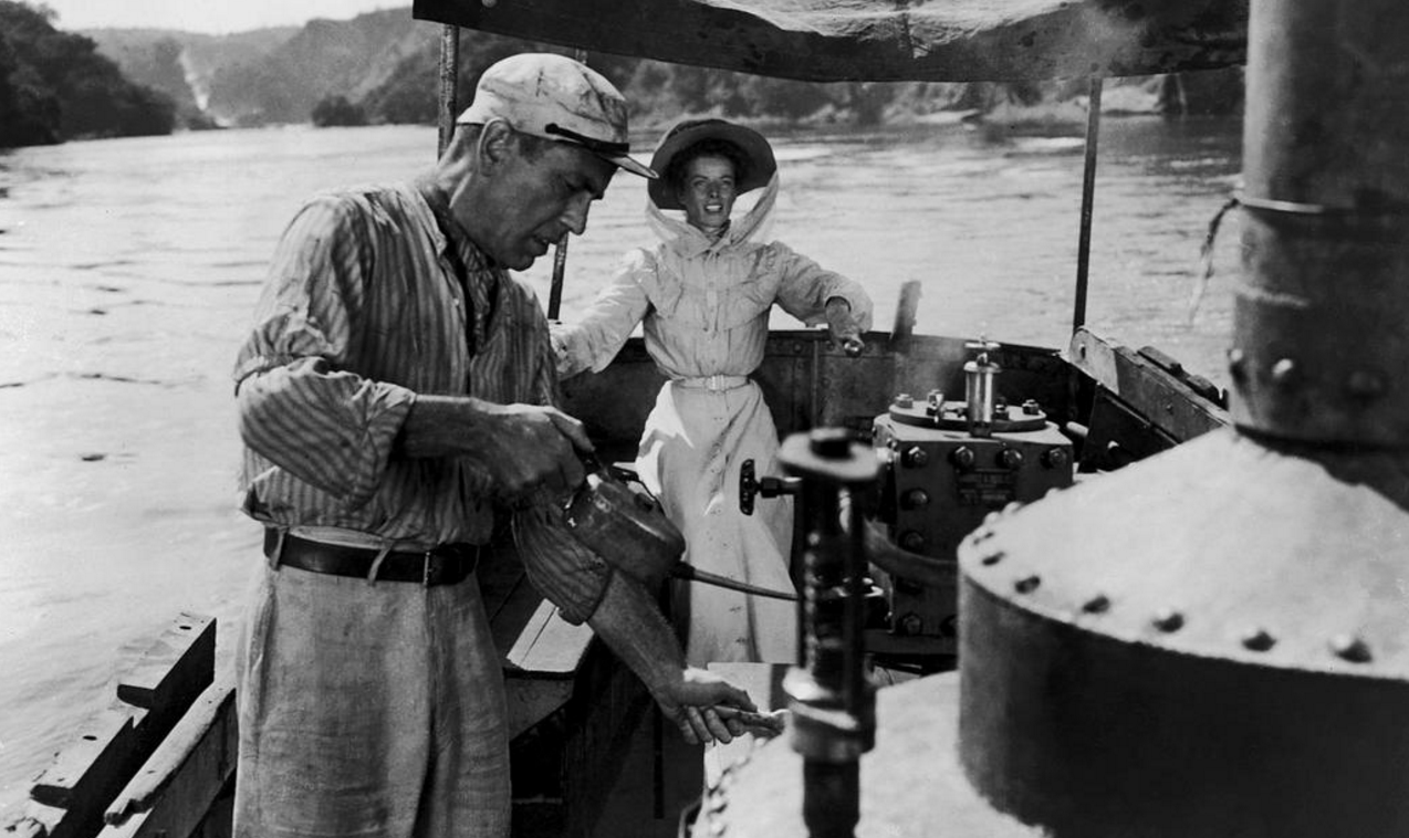 《非洲女王号》,该片于1951年上映,主要讲述的是第一次世界大战时期的非洲,男主人公查尔斯·奥尔耐特是一名因失业而流落到非洲的矿山机械师,女主人公罗斯·塞耶是一位向非洲土人传道的教士。为了抵抗德国人,两人同乘一艘破旧的游艇 “非洲皇后号”,沿河顺流而下。途中,这对个性迥然不同的中年男女不仅产生了真挚的爱情,而且还勇敢地击沉了一艘德国战舰。