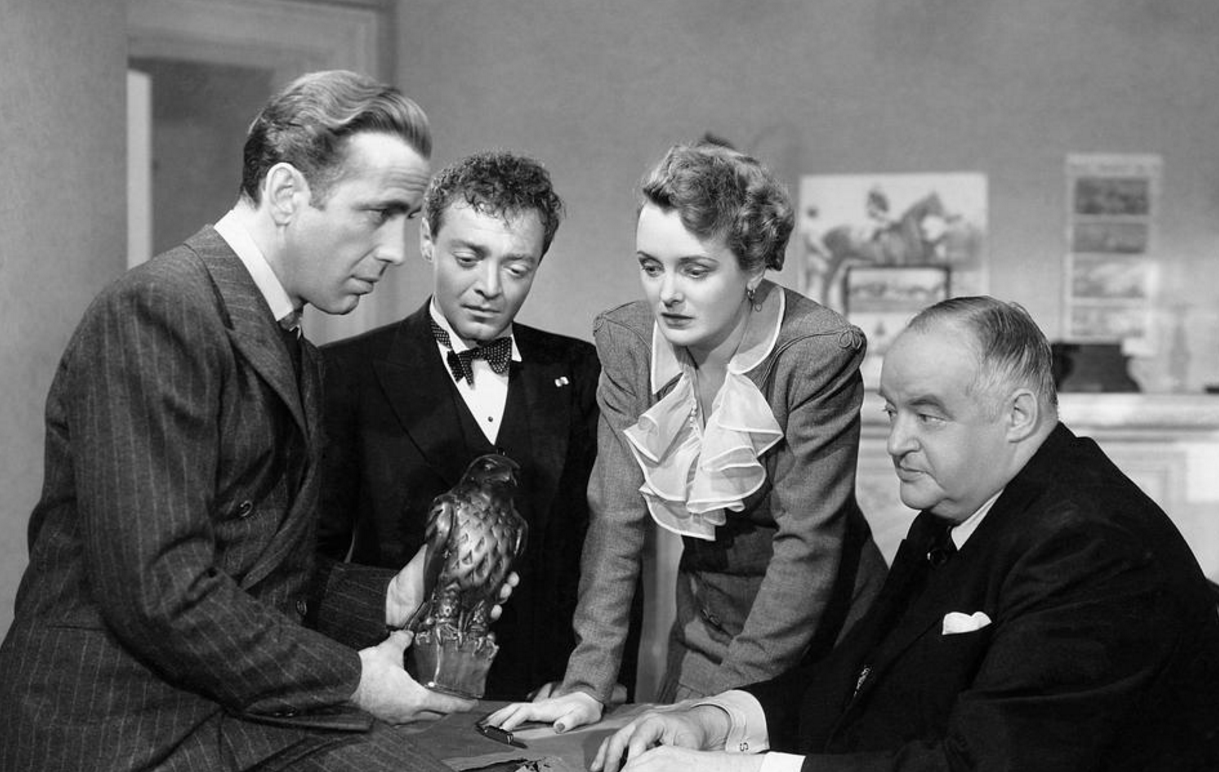 《马耳他之鹰》,该片于1941年上映,主要讲述的是萨姆·斯佩德(亨弗莱·鲍嘉 humphrey bogart 饰)和搭档阿切尔在旧金山市开了一家侦探事务所。一天,一位贵妇(玛丽·阿斯特 mary astor 饰)登门拜访,委托他们寻找自己失踪的妹妹。他们立刻展开调查,发现这名贵妇的妹妹与一位叫做瑟斯的神秘男子在一起。本 来以为这只是一件普通的失踪案,但是事情的发展出乎他们所料。阿切尔在调查案件时被杀害,传说的瑟斯也相继被杀,警方由此怀疑起萨姆与阿切尔的妻子有染而杀掉他的合伙人。深陷泥潭的萨姆依然继续调查案情,他查出贵妇曾与古特曼等流氓倒卖过古玩,之后,古特曼又拜托萨姆帮忙寻找一尊雕像——被称作“马耳他之鹰”的无价之宝。萨姆开始研究起这尊神秘的雕像,结果发现真相就藏在其中。 本片获得第14届奥斯卡最佳影片、最佳男配角、最佳剧本提名奖。