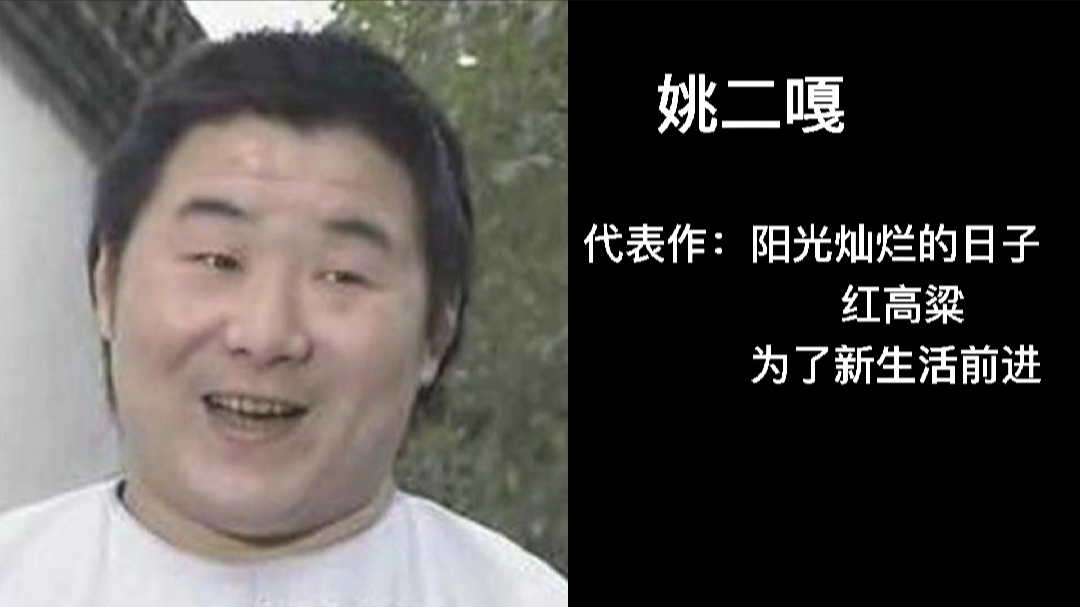 姚二嘎(原名:姚建国),代表作《阳光灿烂的日子》、《红高粱》、《为了新生活前进》。