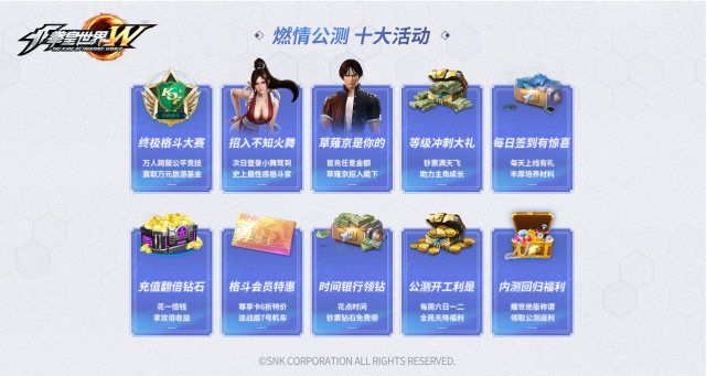 《拳皇世界》公测狂欢盛典也于今日同步开启,海量福利等你来拿。每日登录奖励不断,第2天、第7天登录更能获取超人气格斗家不知火舞和八神庵;每天签到福利满满,超多钻石、钞票、经验汽水等奖励拿到手软;时间银行稳赚不赔,游戏中投资一定数量的钞票或钻石即可在指定时间过后,享受120%~200%的超额返还,躺着也能赚钱!