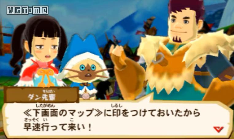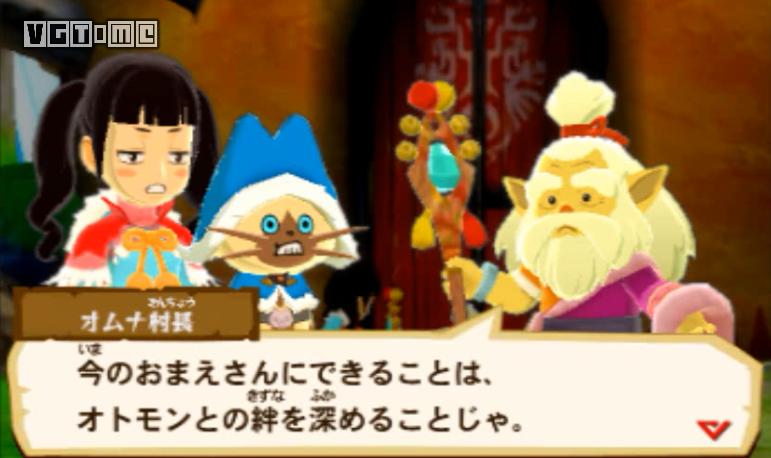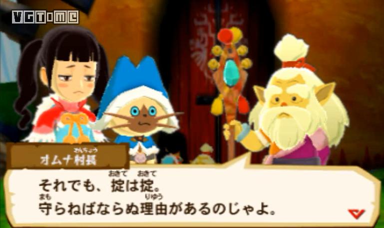 《怪物猎人 物语》毕竟是一个rpg,我们一边看剧情,一边听了个爽。除了几个人物的名字直接用日语念出来之外,你可以明显感觉到他们的语言是有组织、有套路的。从中听出一些门道,便是游戏的另一个乐趣了。