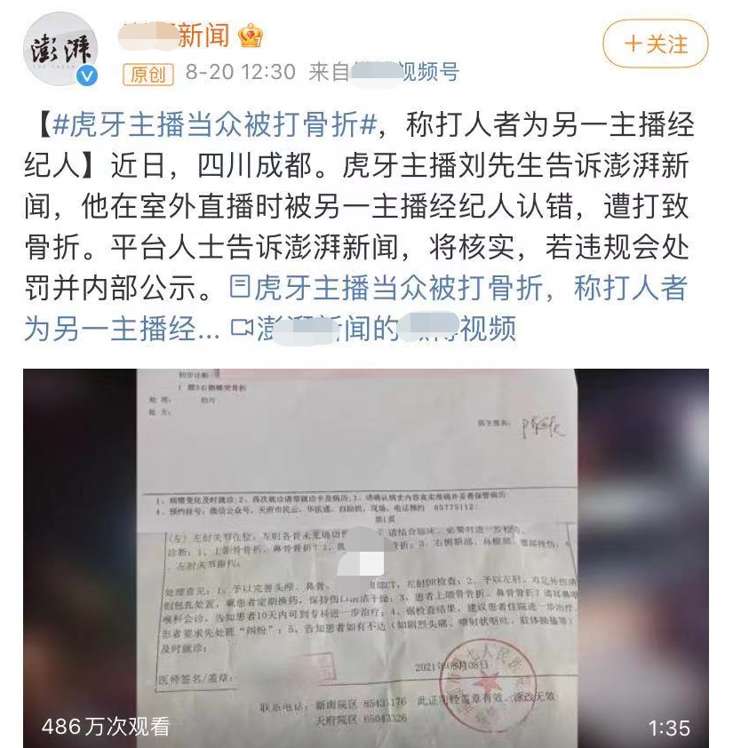 8月20日,知名媒体爆料,某直播平台网红主播刘先生在户外直播时,被另一主播经纪人认错,当众被打骨折,伤势惨重。