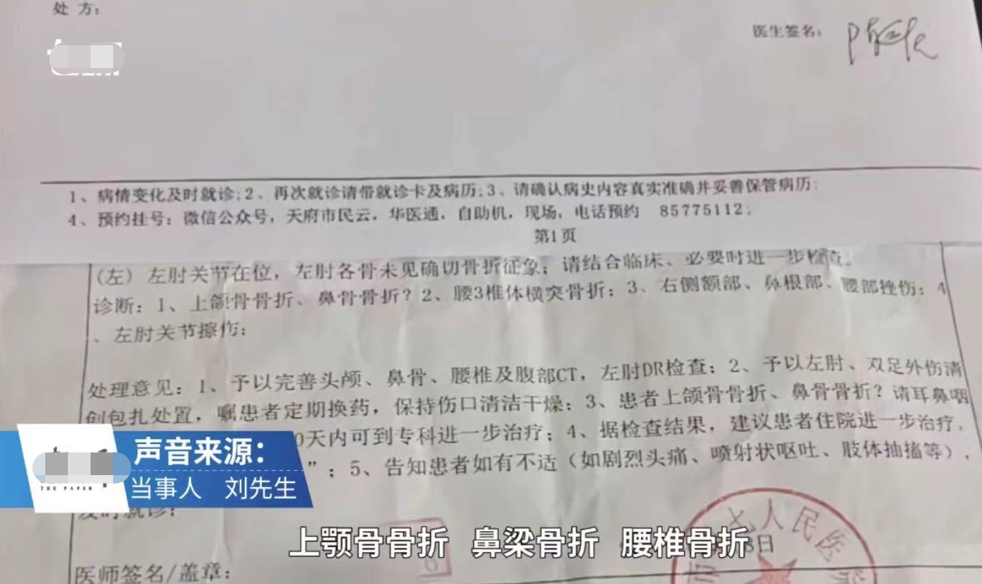 经医生诊断,刘先生受伤惨重,浑身上下三处骨折,分别是上颌骨骨折、鼻骨骨折、以及腰椎骨折。除此之外,他的身上多处部位挫伤、擦伤。
