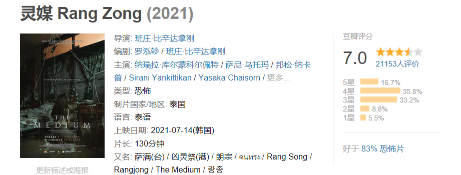 泰韩恐怖片双剑合璧,灵异、惊悚、暴力、女演员为艺术献身全部囊括,在中国台湾地区喜提「18禁」分级。韩国上映首日票房达到了1118493美元,单日票房超过了《黑寡妇》。
