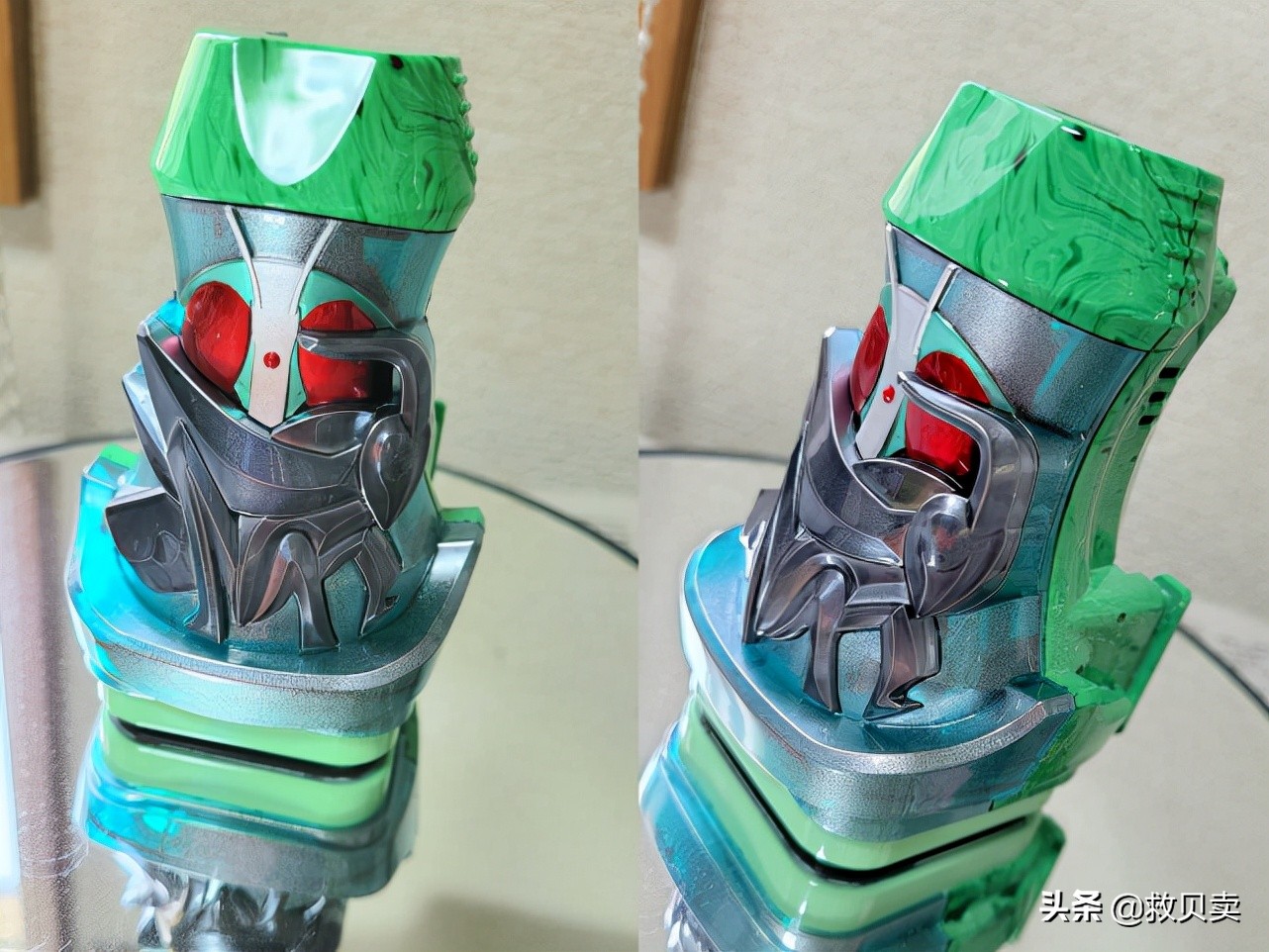 ?还有“蝗虫罪恶印章”,对应假面骑士一号,个人认为这应该是最完美的搭配了,因为只要提起蝗虫骑士,大部分人想到的第一个骑士肯定是一号。原型涂装是淡绿色,有透明感,新造型只修改了部分涂装,让一号的脸显露出来,既让人看着舒服,还特别省事。