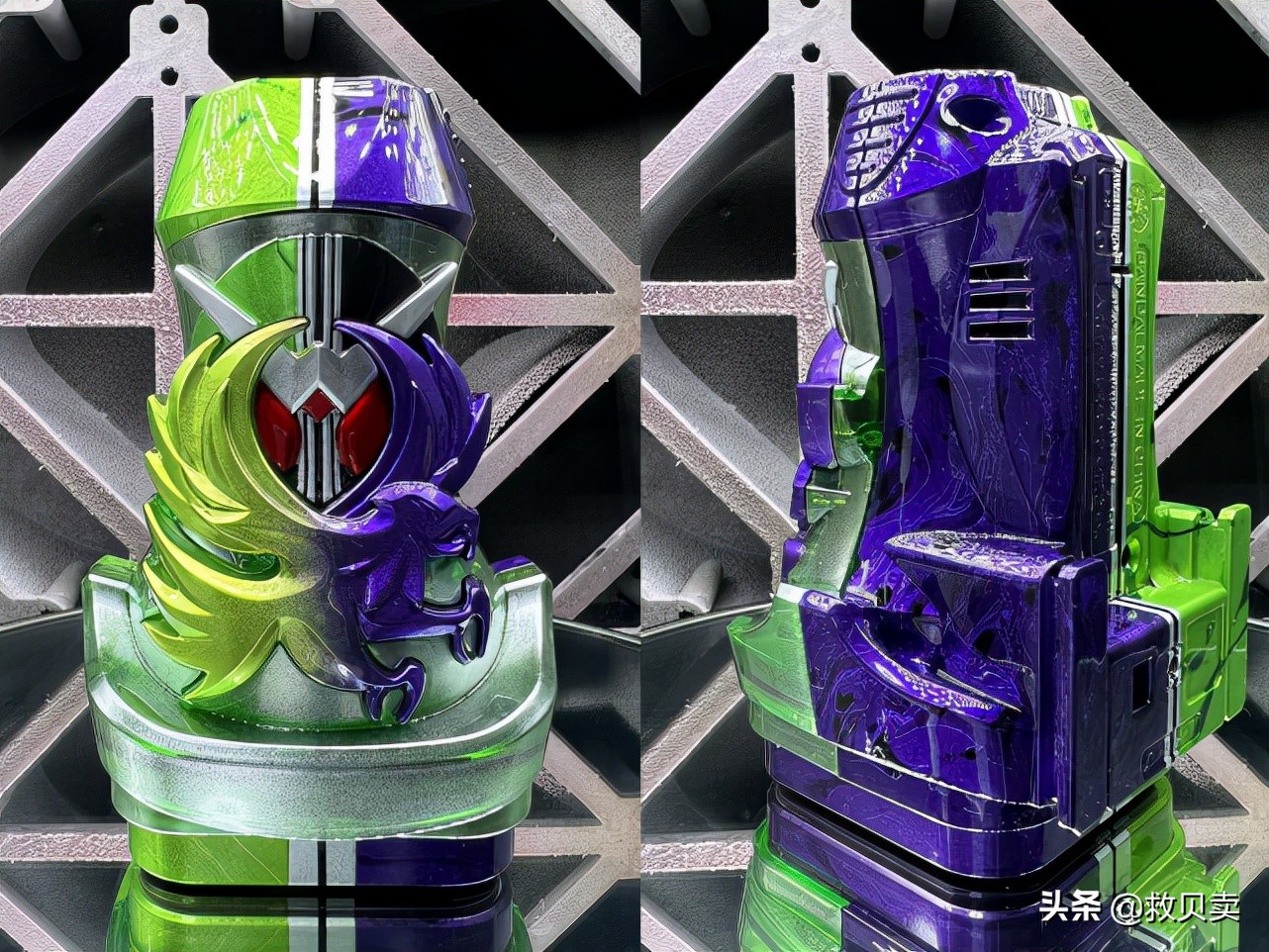 ?接下来是“飞鹰罪恶印章”的重涂作品,对应假面骑士w,所以头像采用疾风王牌的绿色与黑色进行涂装,飞鹰标志使用淡淡的绿黄色与紫色重涂,底座是淡绿色,其他部分采用淡绿色与深紫色涂装,五种颜色泾渭分明,非常协调,算得上很惊艳的作品,估计这个涂装花了很长时间。