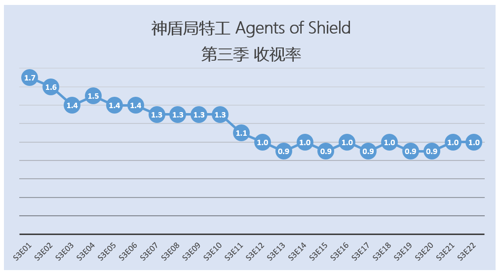 《神盾局特工》第三季平均收视1.2,比第二季跌0.4,相当于第一季的一半。这一年有太多熟面孔离开:安德鲁、皮卡丘、沃德;之前bobbi和hunter因仿声鸟的新剧《最高通缉》离组,但如今也变得毫无意义(《最高通缉》并没有被abc看上)。在本周的记者会上,abc表示正与漫威探讨开发其他新剧的可能,加上《神盾局》下季挪去周二10pm的死亡档期,感觉这部剧的前途不太乐观。多看一集是一集吧…