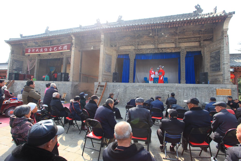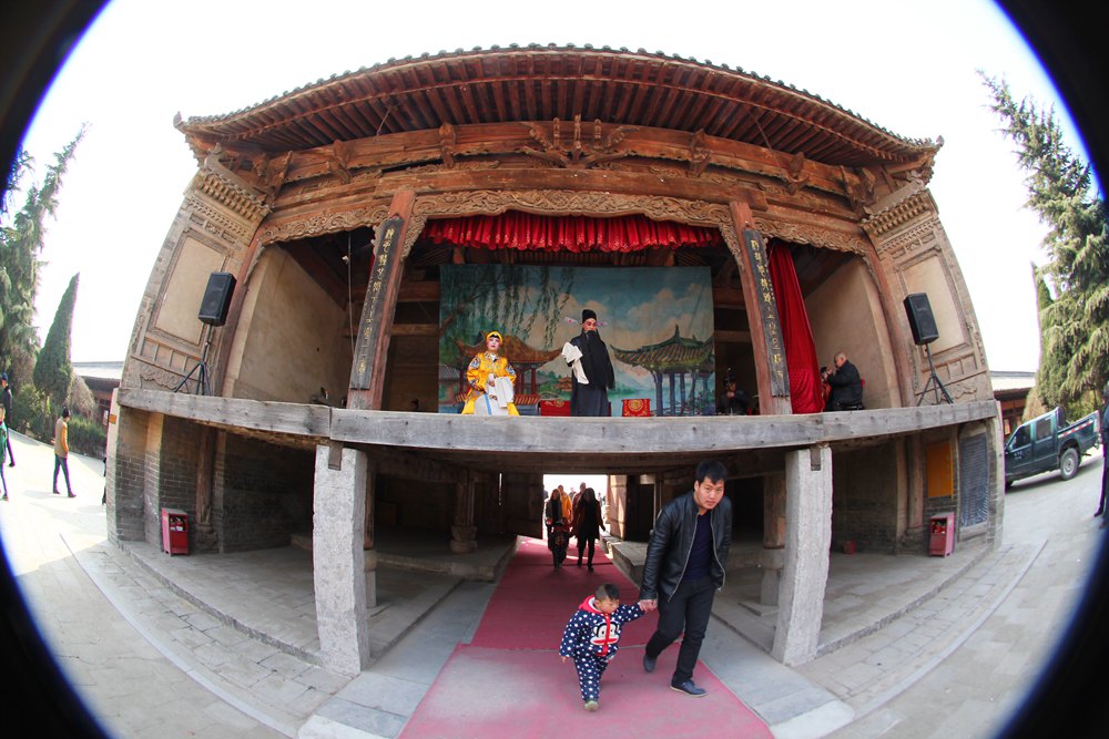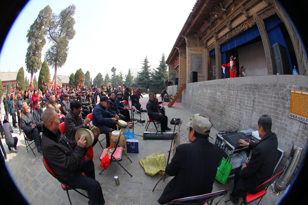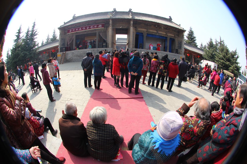 让我们讶异的是穿过这个戏台,面前居然还有两个高低、大小、式样完全对称的戏台,和刚才钻过来的戏台组成了一个“品”字形格局,而且这三个戏台正在同时上演着三台不同的戏,对台戏什么的一比简直弱爆了!跟听戏的老乡一打听,“品”字台全国仅此一处,大概是因为后土祠地处秦晋豫交界处,秦腔、蒲剧、豫剧风行当地,所以才有此难得的奇景,戏迷们爱听哪台听哪台,好不痛快!