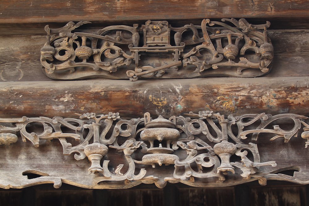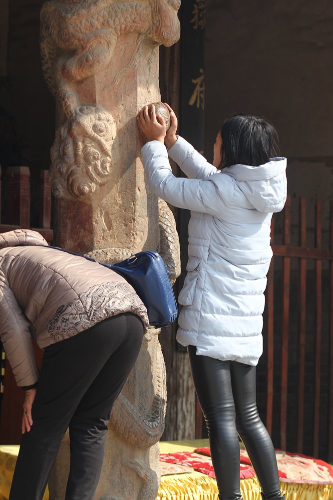 穿过专注听戏和虔诚上香的人群,继续往里走,正殿内三台一坛祭献香供尽在一望之中。神龛中央供奉的便是后土圣母像,而两侧的娘娘,一位怀抱婴儿,一位手拿草药,是替娘娘送子到人间和保佑世人平安的化身。自汉武帝起,先后有唐明皇、宋真宗等9位皇帝24次来此祭祀。皇帝来后土祠求什么呢?我猜除却彰显天赐皇权之外,愿望无非很朴素的两个——打粮食和生孩子,祈求土地之神保佑五谷丰登,祈求中华始祖保佑自己子孙繁盛。