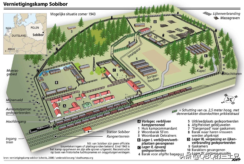 索比堡灭绝营位于卢布林地区索比堡村附近,始建于1942年3月,是灭绝波兰犹太人的“莱茵哈德计划”的重要组成部分。在这个人间地狱,先后有25万名欧洲犹太人遇害。乘坐火车抵达这里的犹太人,平均存活时间不超过一天。除了一些具有专业技能的人,其余绝大多数会被立即送进毒气室处决,只有财物和衣服被留下支持帝国的“伟大事业”。