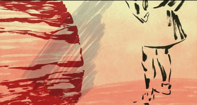 除此之外,导演还设计了很多奇特的表现手法。比如动画里表示王子作战的时候,并没有直接绘制战争场面,而是简单画了劈砍和火焰的效果。